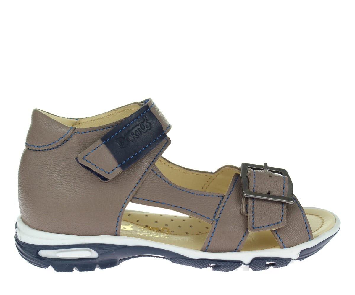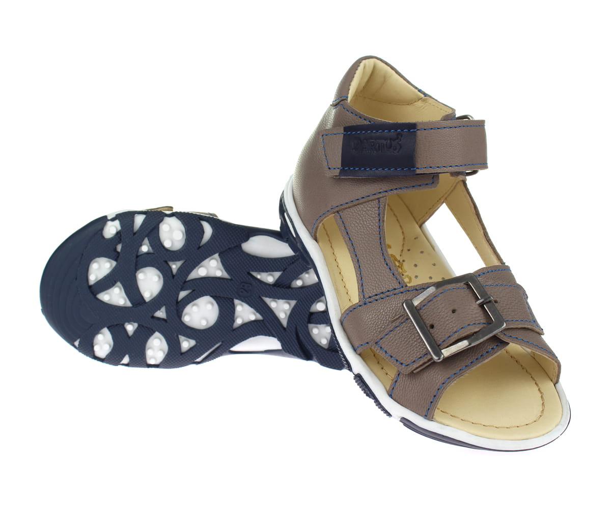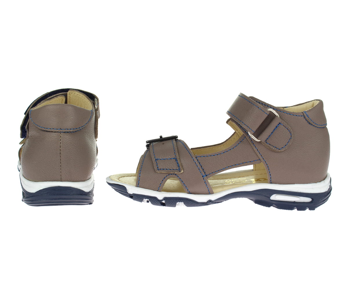 Sandałki od początku do samego końca zostały wyprodukowane w naszej firmie. Piękne, klasyczne buciki wykonane w całości ze skóry naturalnej. Fason z odsłoniętymi paluszkami będzie bardzo praktyczny podczas ciepłych dni. Precyzyjne szycie podkreśla kształt bucików. Zapięcie na mocny rzep oraz sprzączka umożliwiają jednocześnie regulację obuwia, a co najważniejsze to możliwość dopasowania go do stopy dziecka. Usztywniona pięta to główna zaleta tego modelu. Wnętrze skórzane, miękkie z profilowana wkładką, która zapobiega powstawaniu płaskostopia. Podeszwa granatowo biała, termoplastyczna wzmacnia stabilność kroków. Te buty to idealne połączenie stylu oraz komfortu.
